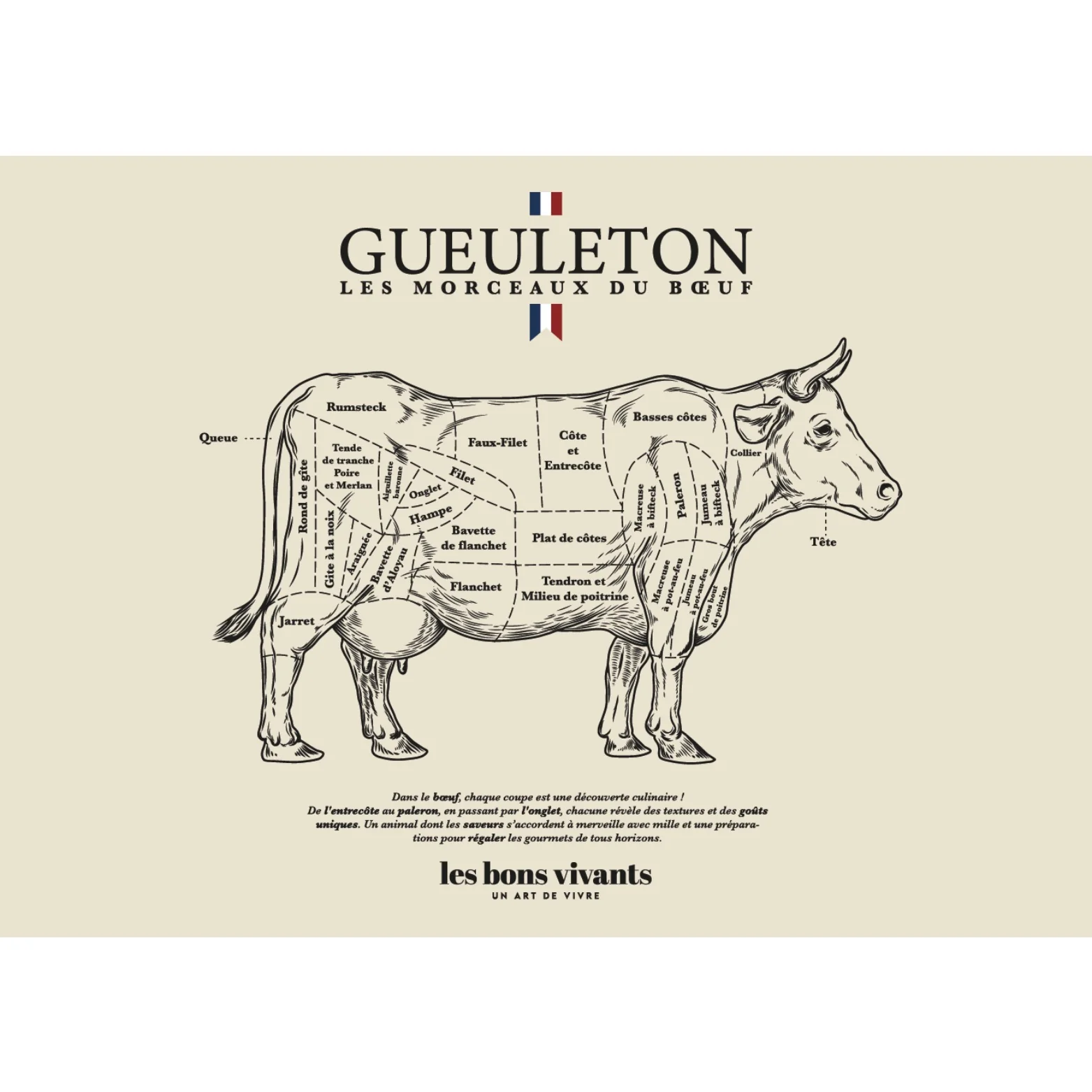 DĂ©couvrez l'affiche Gueuleton des morceaux de bĆuf, une illustration dĂ©taillĂ©e de la dĂ©coupe française traditionnelle. Ce poster de 50x70 cm met en avant les diffĂ©rents morceaux de bĆuf comme lâentrecĂŽte, le filet, et le paleron, idĂ©al pour les amateurs de viande et les passionnĂ©s de charcuterie française. Affiche murale parfaite pour les bons vivants, ajoutant une touche authentique Ă votre cuisine.